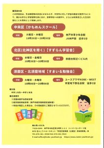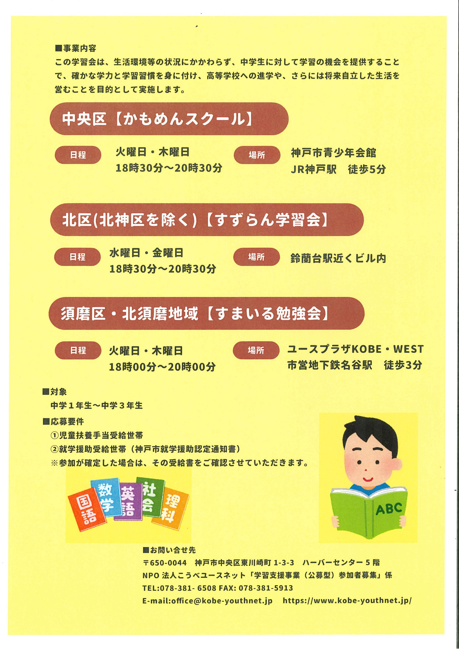 神戸市学習支援事業【公募型】参加者(随時)募集 2025年11月26日 最終更新日時 : 2025年11月26日 kynkanri 各会場にて状況が違いますので、まずはご連絡の上、内容をご確認ください! FacebookXBluesky